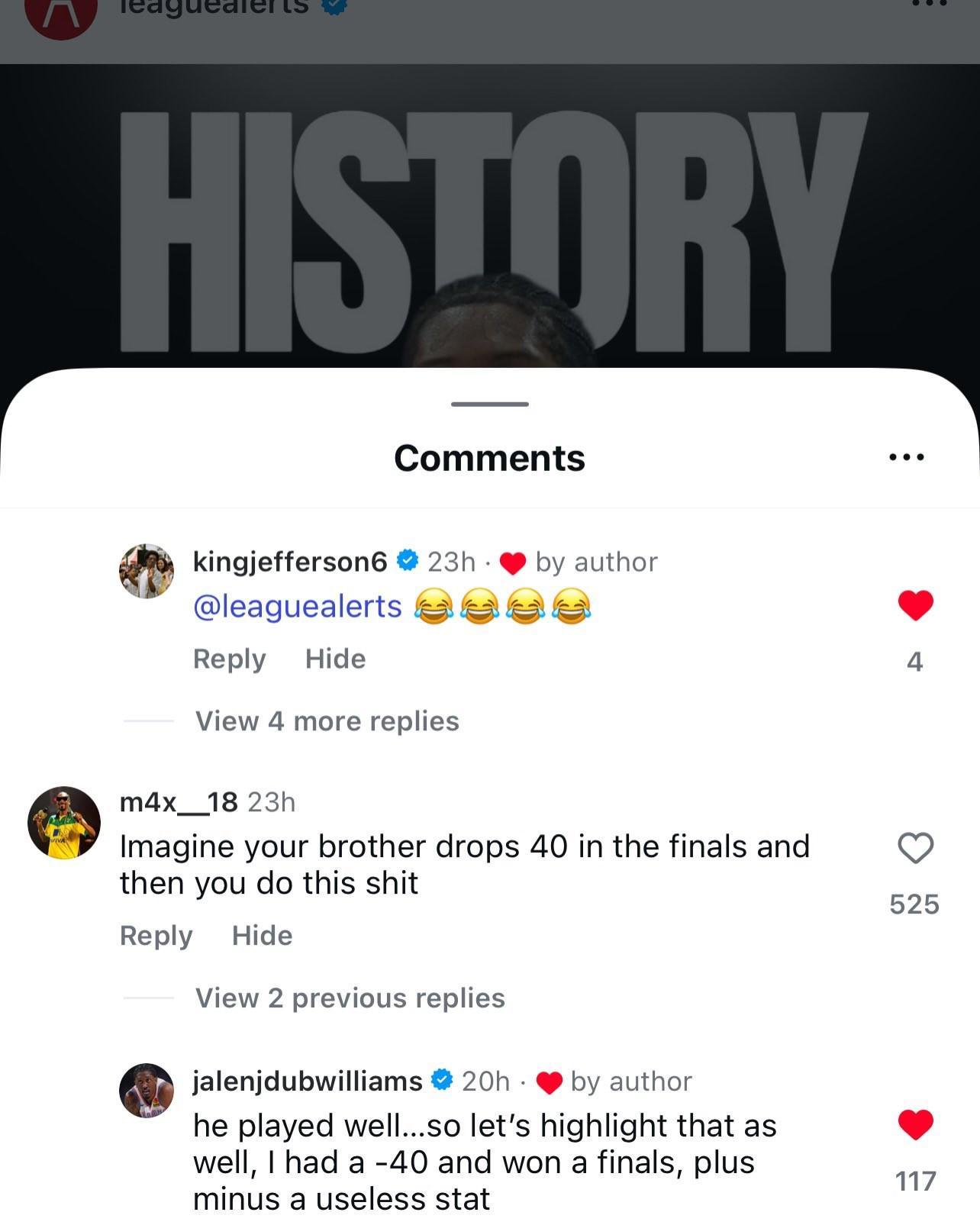 随后有球迷在科迪-威廉姆斯的这一反向数据纪录的新闻中流言讽刺他:“想想你的哥哥在总决赛爆砍40分,而你却这个x样。”杰伦-威廉姆斯看到后回复道:“他打得很好……但值得一提的是,我的正负值是-40,但我赢得了总冠军,正负值根本没用。”